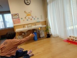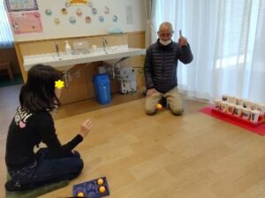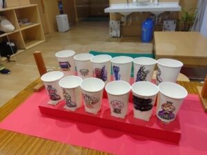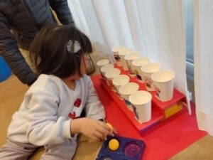 みんなが思いを込めて描いたひなまつりカップに狙いを定めてピンポン玉を投げていきます。「いくつ入ったかな~」「私のカップに入ったよ~」こんなひな祭りも楽しくて素敵ですね😊