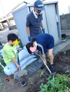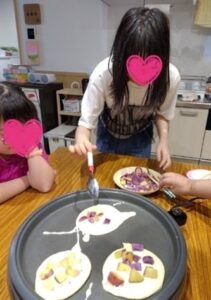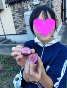 今年もさつま芋堀に誘っていただきました!はりきって芋掘りに参加するわんぱくっ子たちで、ツルを引っ張ってスコップで土を掘り起こし収穫していく姿がとってもたくましかったです!収穫後は、早速おやつ作り♡「さつま芋入りのホットケーキ」を作りました!さつま芋を切ってみると中が鮮やかな紫色のお芋もあり、心躍る体験ができました!今年も収穫体験に誘っていただきありがとうございました。