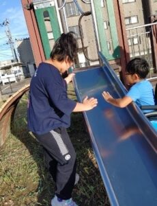 夏の暑さが和らぎ、久しぶりの公園‼散歩も久しぶりでウキウキ気分のわんぱくっ子たちでした‼専門学校の看板を見て「リス‼」と大興奮!「隠れミッキー」のように「隠れリス!」がいました♡反対側の看板にもちょこんと一匹♡見つけた子どもたちは大喜び!素敵な遊び心に感動しました~‼