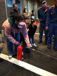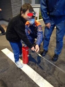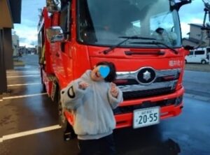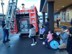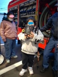 わんぱくステーションで防災訓練を行いました!訓練では火災が怖くてびっくりする子もいましたが、職員の指示に従ってみんなばっちり避難ができました!その後は消防車見学😊これを楽しみにしていたわんぱくっ子たちは、消防隊員のお兄さんの話を真剣に聞いています。重いホースや酸素ボンベを持って、隊員さんたちの大変さもよ~くわかったようです。消火器で火を消したり、防護マスクをかぶったり貴重な体験もでき、いい訓練になりました‼